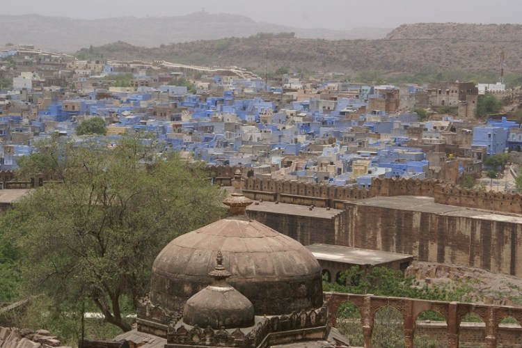 ‘Nous voici à Jodhpur, la fameuse cité bleue de l’Inde (les façades des maisons sont peintes en bleues). Nous sommes arrivés hier après plusieurs heures de route ponctuées par deux arrêts dans des temples superbes et un fort où se trouve la 2e plus grande muraille du monde après la muraille de Chine. Nous avons déniché un hôtel cinq étoiles avec piscine et service hors pair pour l’équivalent de 30$ la nuit, plutôt que l’habituel 75$ la nuit. Ce matin, comme l’internet de l’hôtel ne fonctionnait pas, le proprio nous a invité dans sa demeure personnelle pour qu’on utilise son ordi. L’internet ne marchait pas non plus mais sa maison valait le détour.’