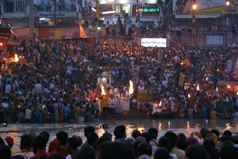 ‘Le lendemain, nous nous sommes retrouvés à Haridwar, une ville sacrée où les Indiens vont en pèlerinage. Des dizaines et des dizaines de milliers de personnes se rassemblent sur le bord du Gange. Assis sur des couvertures métalliques aux effigies de M&M et autres vendues au coût de 5 roupies (12,5 cents), ils patientent pendant une heure ou deux en faisant des prières ou en répondant aux cris de ralliement. Vers 19h30, une cérémonie débute, alors qu’on allume de gros lampions. Ça dure environ cinq minutes, puis tout le monde se lève et s’en va!