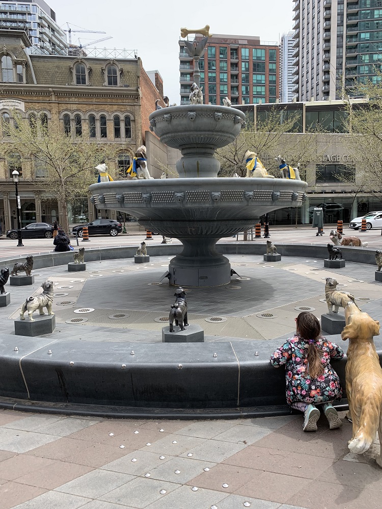 - The Dog Fountain : Situé dans le parc Berczy, à un bloc de Yonge Street et à proximité de la gare, ou encore en chemin vers le St.Lawrence Market, se trouve cette sympathique fontaine où les jets d’eau sortent de la bouche d’une quinzaine de chiens qui regardent tous dans la même direction: ils salivent à la vue d’un beau gros os en or juché en haut de la fontaine!