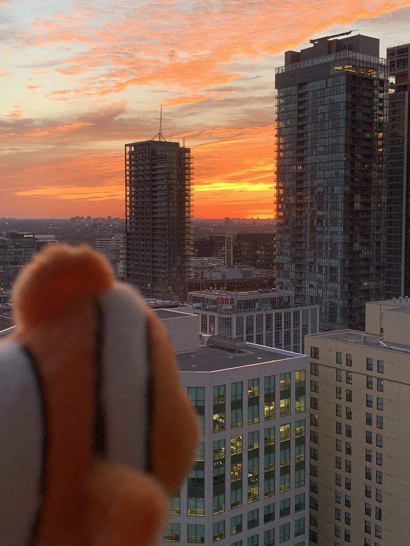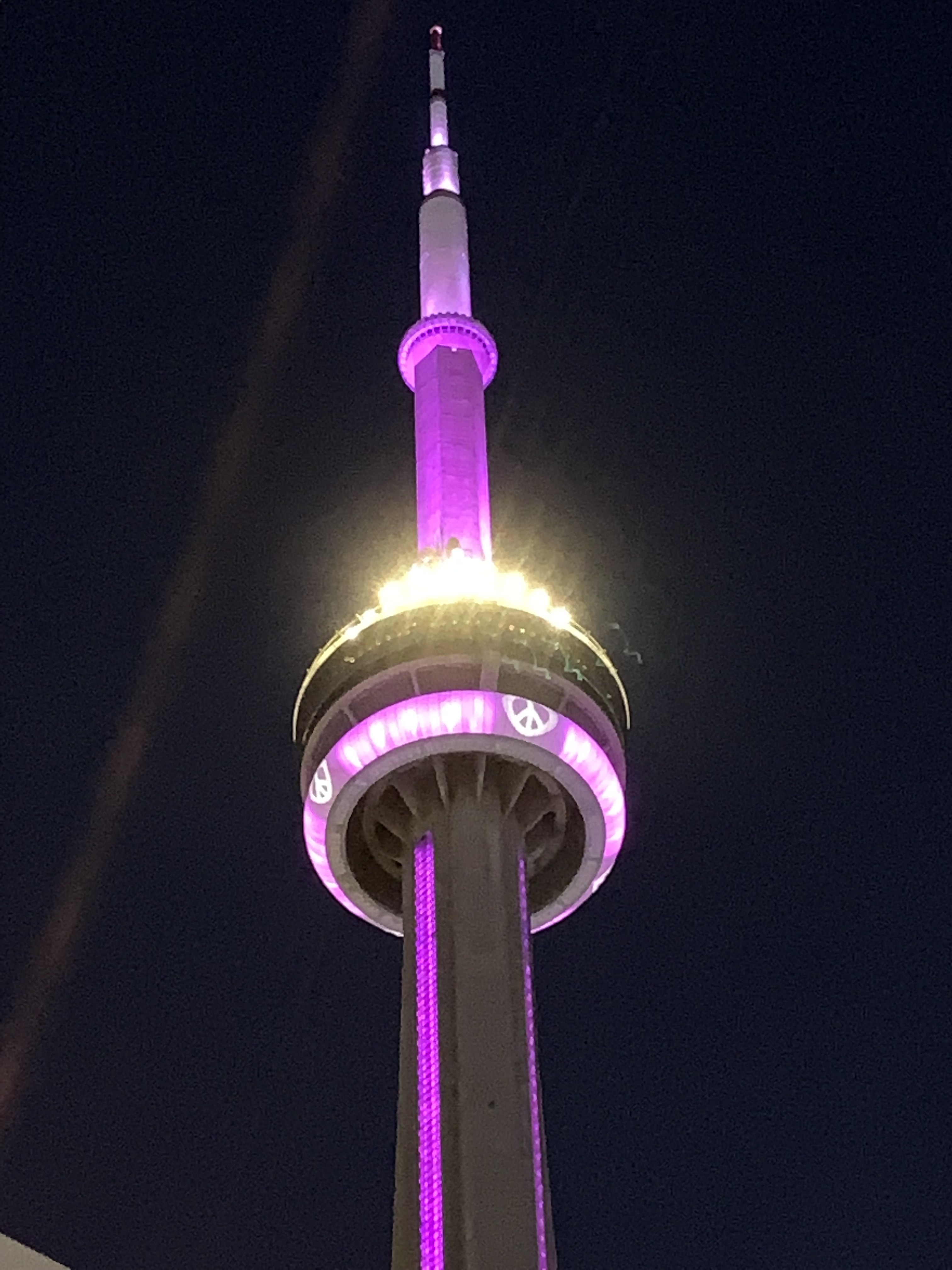 Avant d’aller retrouver nos deux compagnons de voyage à la gare, nous avons bifurqué vers le Berczy Park. (À lire dans Le Toronto préféré des enfants). C’est ensuite que nous avons découvert, les yeux bien écarquillés, notre AirBnb pour le weekend. Au moment de la réservation plusieurs mois passés, je n’avais pas réalisé que l’appartement se trouvait au 27e étage. Wow, quelle vue! Et quel coucher de soleil nous avons eu ce soir-là. Mais pour l’instant, on avait encore trop de choses à découvrir, alors direction Chinatown et Kensington Market, puis souper dans un petit endroit tranquille et fort sympathique à une extrémité de la rue Henry. Et au moment où on s’apprêtait à aller faire dodo, on a décidé de ressortir voir la Tour du CN, illuminée en cette belle soirée de début mai. Un petit moment magique.
