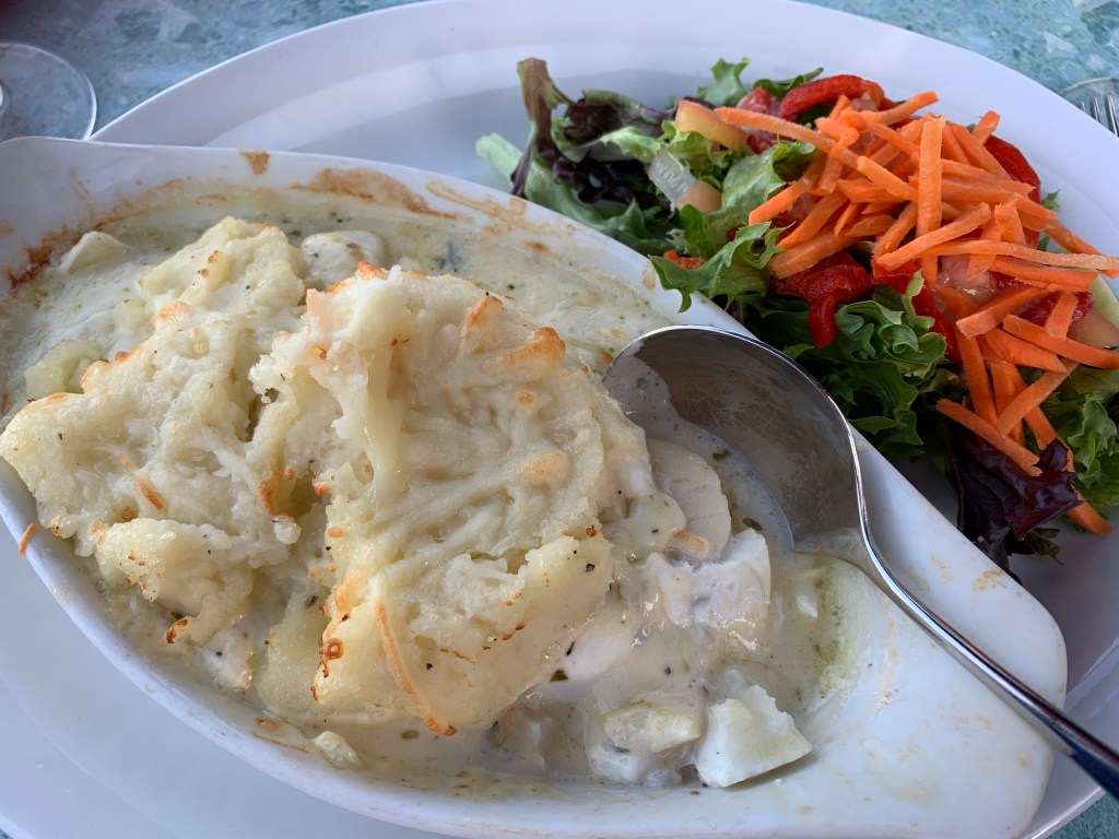 Salty’s: Une grande terrasse sur le bord de l’eau, certes située là où les touristes sont nombreux, mais le décor est agréable, et le plus agréable est qu’ils ont un menu ‘sans gluten’ (qu’ils apportent sur demande) et ce menu contient plusieurs choix intéressants. J’ai hésité longtemps entre le plat de crevettes et celui de saumon. J’ai finalement fait fi de mon habitude de ne pas consommer de lactose et j’ai choisi la casserole de fruits de mer, dans laquelle se trouvaient saumon, crevettes, pétoncles et aiglefin, le tout dans une sauce crémeuse au basilic, surmonté de patates pilées et de parmesan gratiné. Inutile de vous dire que c’était délicieux.