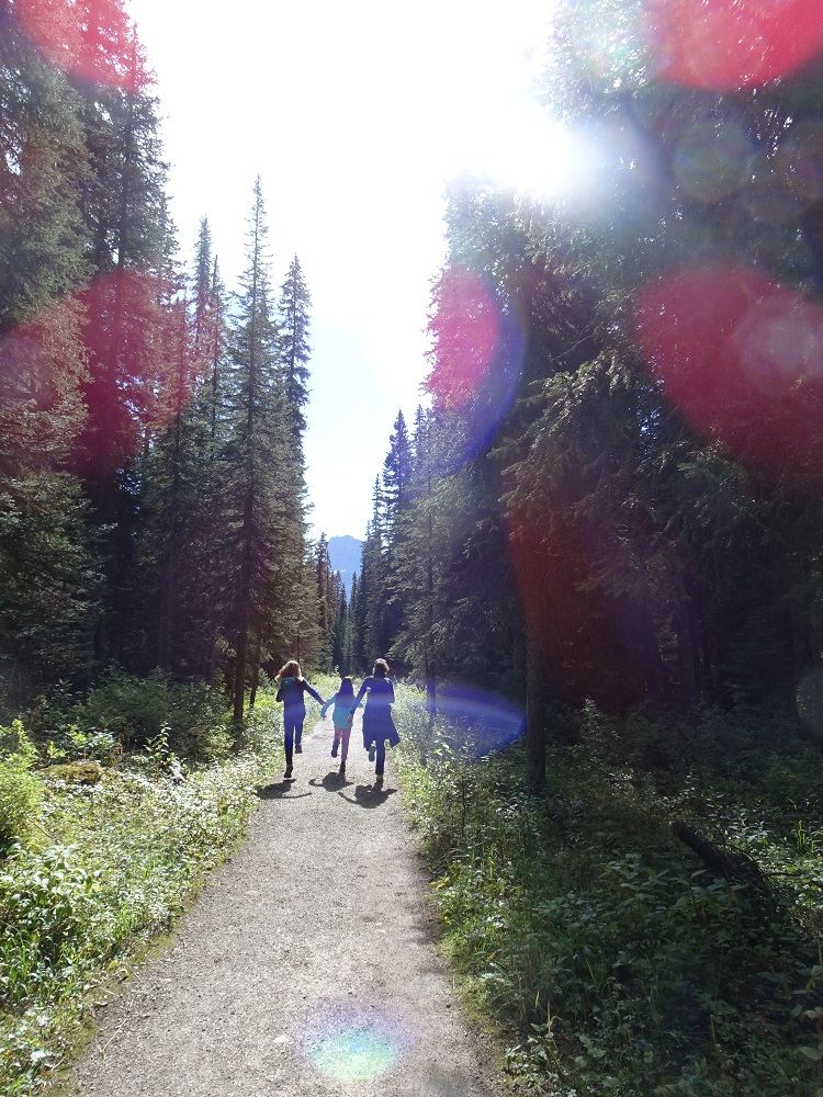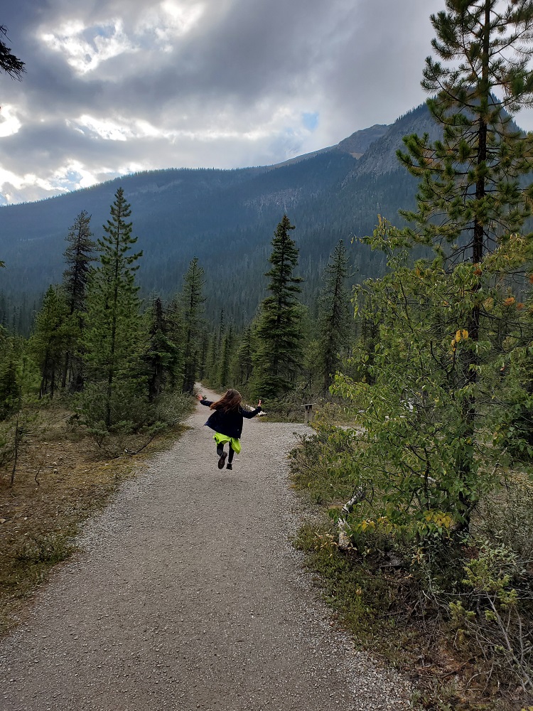 Après s’être munis d’une carte des sentiers au centre des visiteurs, nous reprenons la route vers Golden. Il est 16h30 et une pancarte nous indique la route vers le Lac Emerald. Le lac de mes rêves. On prévoit y revenir très tôt le lendemain matin, car le stationnement se remplit vite. Mais comme nous y sommes maintenant, nous décidons de bifurquer et d’aller y jeter un coup d’œil. Et le coup de cœur arrive. Ce lac turquoise majestueux est devant nous, et des espaces de stationnement sont disponibles. Selon ma lecture rapide de la carte, le tour du lac correspond à 1,6km. Facile que je me dis. Et hop on s’élance tous les quatre… Pour se rendre compte une heure et demi plus tard que nos montres indiquent plutôt 5km! Ce n’est pas bien grave, il est 18h30 et il fait encore clair. Et la randonnée nous a permis d’admirer le lac sous tous ses angles. Mais leçon apprise pour les prochains jours, assurons-nous de bien lire les cartes et de bien évaluer les distances avant de s’élancer!