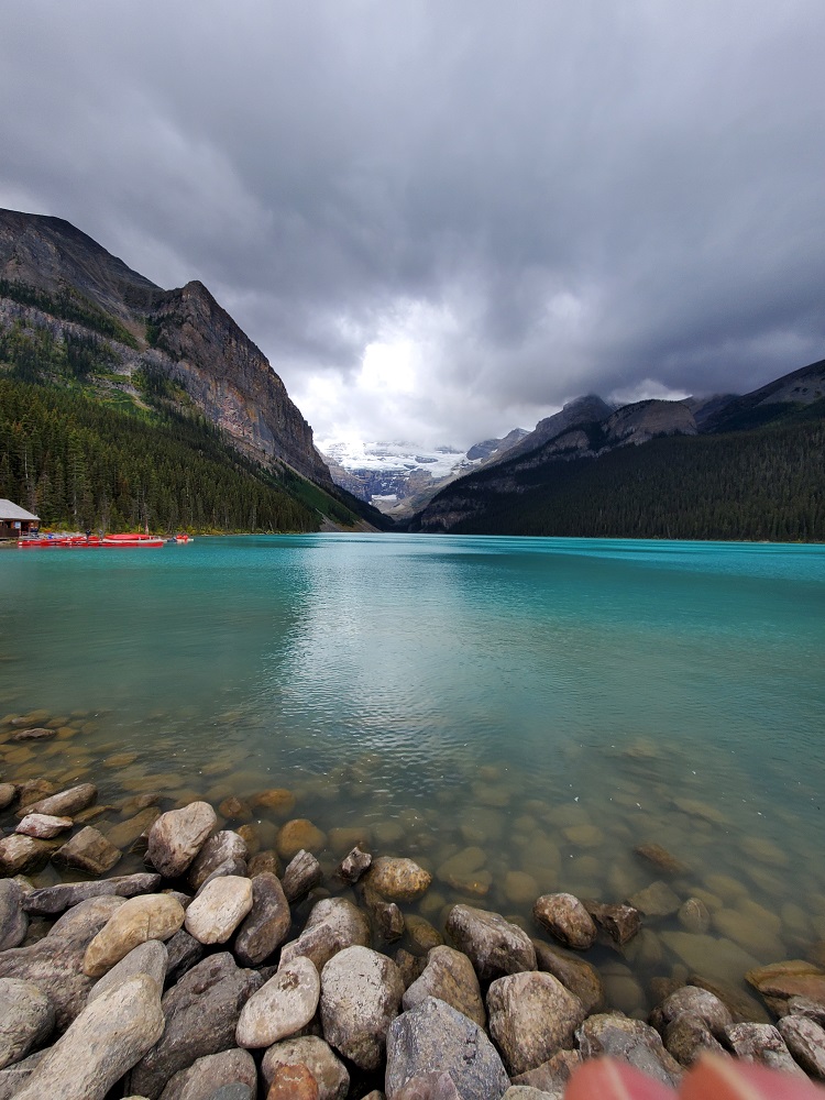 On doit maintenant reprendre la route vers Calgary. Mais pas avant d’essayer d’aller voir le Lac Louise, et encore mieux, le Lac Moraine. On s’enligne pour se rendre au centre de ski du Lac Louise, en espérant qu’il restera de la place pour nous dans une des navettes qui pourraient nous amener voir ces lacs. Mais à notre arrivée au village, la barrière vers le stationnement du Lac Louise est ouverte, signe qu’on peut s’y rendre en voiture. On s’élance donc sur la route. La barrière vers le Lac Moraine est baissée, signe que le stationnement est plein, mais bon, au moins nous pourrons montrer le fameux Lac Louise aux enfants. Bien qu’après notre merveilleuse visite au Lac Emerald le Lac Louise nous apparait fort achalandé, nous sommes tout de même contents de notre arrêt. Puis la pluie se met de la partie, et c’est finalement dans la voiture que nous mangerons notre picnic.