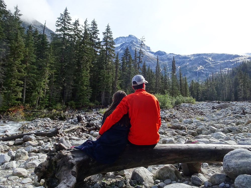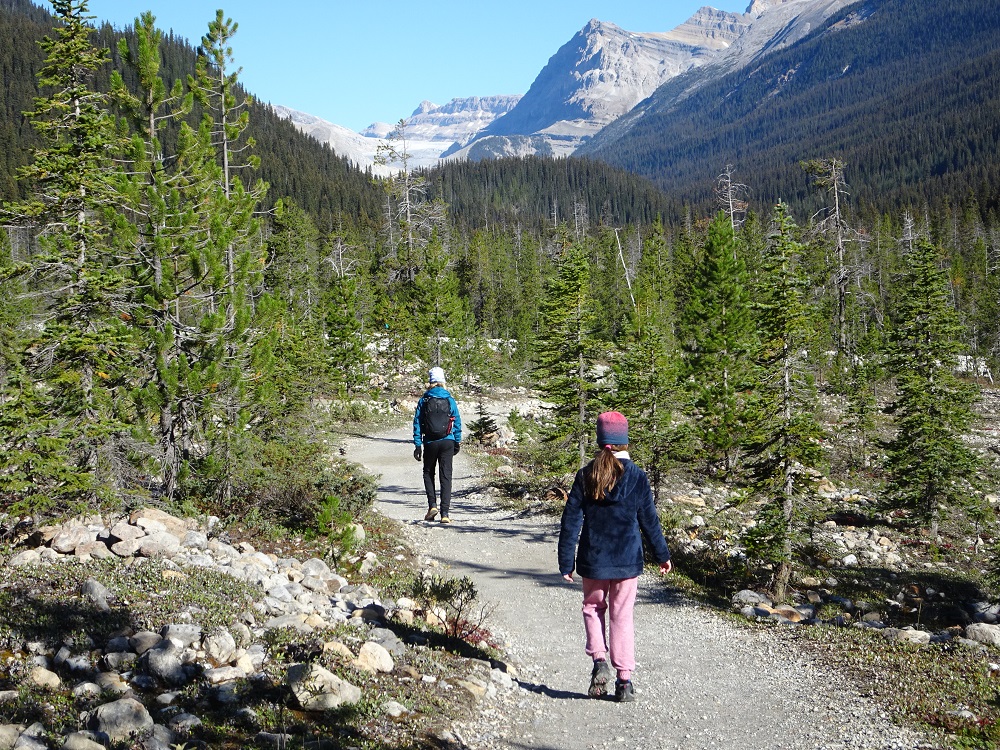 Le choix d’aller dans cette direction est aussi stratégique et nous aide à gérer notre fatigue. Car bien que la ville de Golden où nous avons dormi soit située en Colombie-Britannique, elle vit à l’heure de l’Alberta (moins deux heures par rapport au Québec). Toutefois, le début du sentier de la randonnée qu’on a choisi se trouve à proximité du col Rogers (mieux connu sous son nom anglais de Rogers Pass), qui vit à l’heure de la Colombie-Britannique (moins trois heures par rapport au Québec). Comme nous devons attendre l’ouverture du centre des visiteurs pour se procurer notre laissez-passer pour la journée, cette petite heure de différence nous donne l’occasion de laisser dormir les enfants un peu plus longtemps, et de partir tous les quatre de bonne humeur.