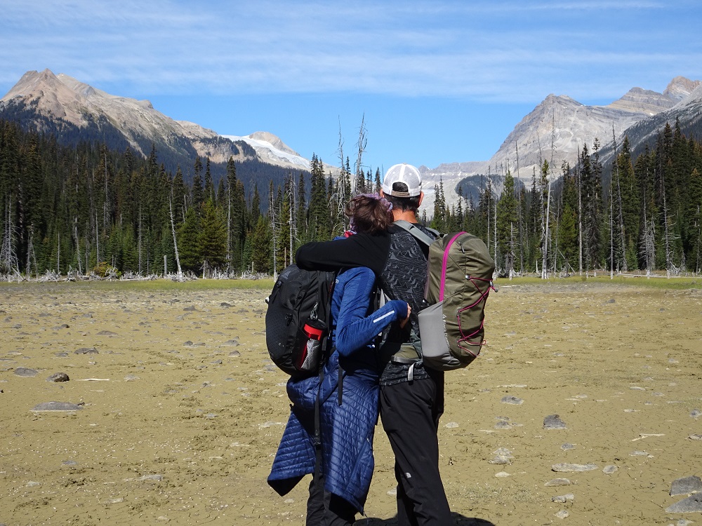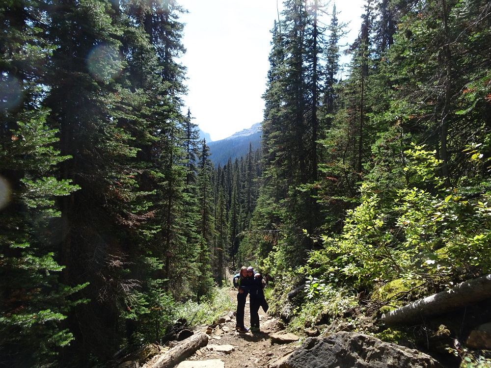Dimanche : Aujourd’hui, c’est le Parc national Yoho qui nous attend. Et je l’attendais depuis longtemps celui-là! Je ne sais pas pourquoi, mais j’avais une attirance inexplicable envers ce parc. Peut-être le nom, que je trouve simplement sympathique, et qui en réalité veut dire ‘respect’ ou ‘étonnement’ en langue Crie. C’est donc très excités que nous sommes partis à la découverte de ses chutes. D’abord les Takakkaw Falls, hautes de 254 mètres et accessibles facilement car situées à environ un kilomètre d’un stationnement. En langue Crie, Takakkaw signifie ‘c’est merveilleux’. Quatre ou cinq kilomètres plus loin, sur un sentier assez plat mais encore une fois entourés de montagnes et d’un paysage sublime, nous attendent les Laughing Falls, fort jolies, ainsi que la rivière Yoho au bord de laquelle nous nous sommes assis pour manger notre diner.