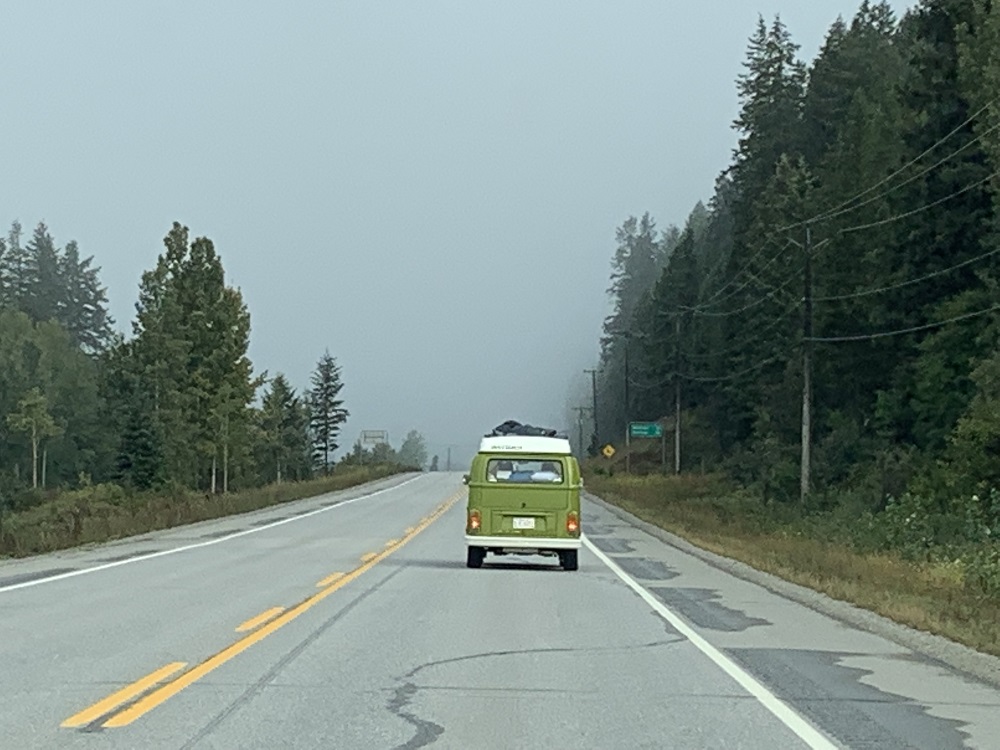 La route jusqu’au centre des visiteurs de Rogers Pass nous prend environ une heure. On suit un beau Westfalia (mon rêve!) et chacun des paysages rencontrés nous fait éclater de rire d’étonnement, ou nous fait écarquiller les yeux. Les nuages et les montagnes, qui sont maintenant en vérité les Selkirk et non plus les Rocheuses, se partagent l’horizon, et nous apprendrons plus tard que nous avons droit aux premières neiges de la saison, qui éblouissent encore plus les montagnes de leur blancheur.