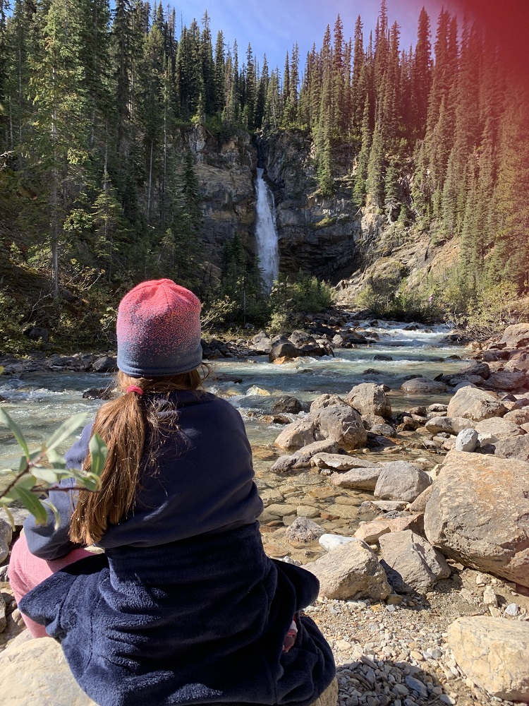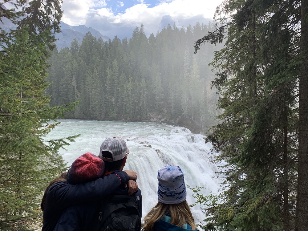 Lundi : Après avoir dit au revoir à notre adorable logement, nous nous dirigeons à nouveau vers le Parc national Yoho, cette fois pour aller voir les Chutes Wapta. Une petite randonnée de 5km aller-retour sur un sentier somme toute facile. Mais quelles chutes! Il est possible de s’y approcher suffisamment pour être mouillés, et c’est là que le fou rire nous prend, à tenter de prendre un selfie familial malgré le bruit des chutes, les roches glissantes et l’eau qui nous assaille. Le soleil plombe et forme avec les chutes un arc-en-ciel. Un autre moment magique de notre voyage.