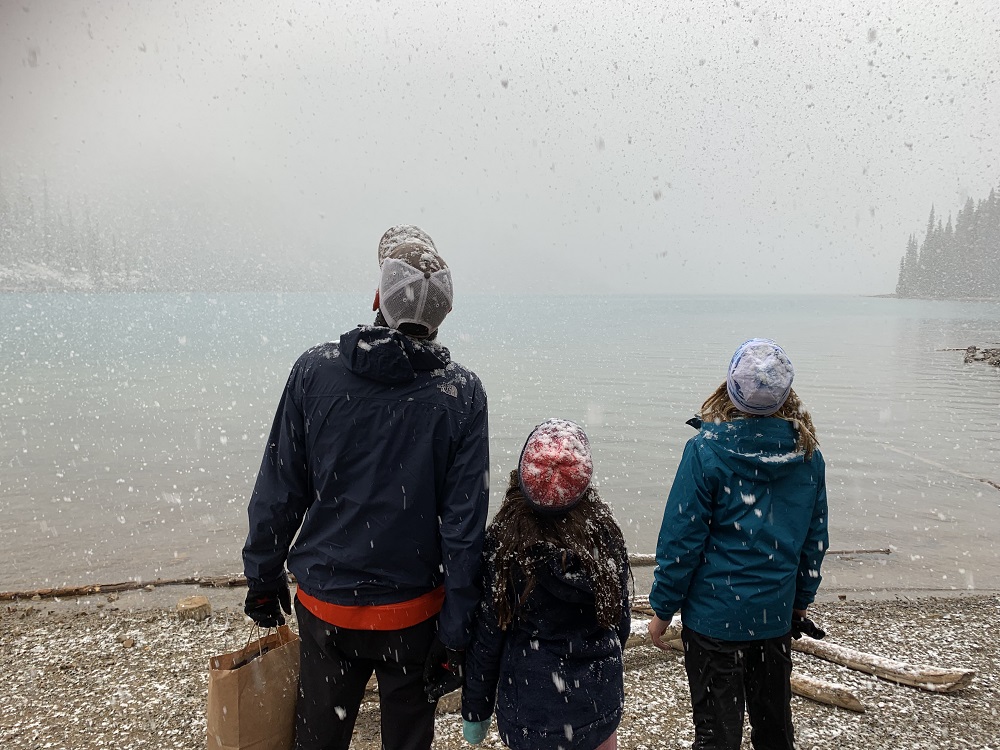 Mais la pluie aura cet avantage sur notre journée : le stationnement du Lac Moraine se vide et c’est une barrière ouverte qui se présente devant nous à notre départ du Lac Louise. À nous le Lac Moraine! Et c’est là que la pluie se transforme en neige, et malgré les nuages qui nous empêchent de voir les fameuses montagnes sœurs, si belles qu’elles ont été imprimées sur les billets de 20 dollars pendant des années, le lac et le moment demeurent majestueux. Un petit chocolat chaud plus tard et quelques souvenirs achetés, nous reprenons la route vers Calgary, pour une dernière expérience albertaine (et une promesse faite aux enfants si la journée se déroulait bien) : un souper dans un ‘vrai’ Steakhouse, pour manger du fameux bœuf de l’Alberta! Et on se gâte : les assiettes de filet mignon, de surf and turf et de crème brûlée se vident en un rien de temps.