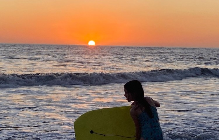 Jour 2 : Avant de déjeuner, on va à la mer. Puis on mange des crêpes. Et après le déjeuner on retourne à la mer. On mange une sandwich décomposée pour diner et ensuite zzzz dodo d’après-midi! On retourne ensuite à la plage et on apporte deux bodyboard, c’est trop COOL! Pour souper je mange deux tacos au poulet. MIAM!