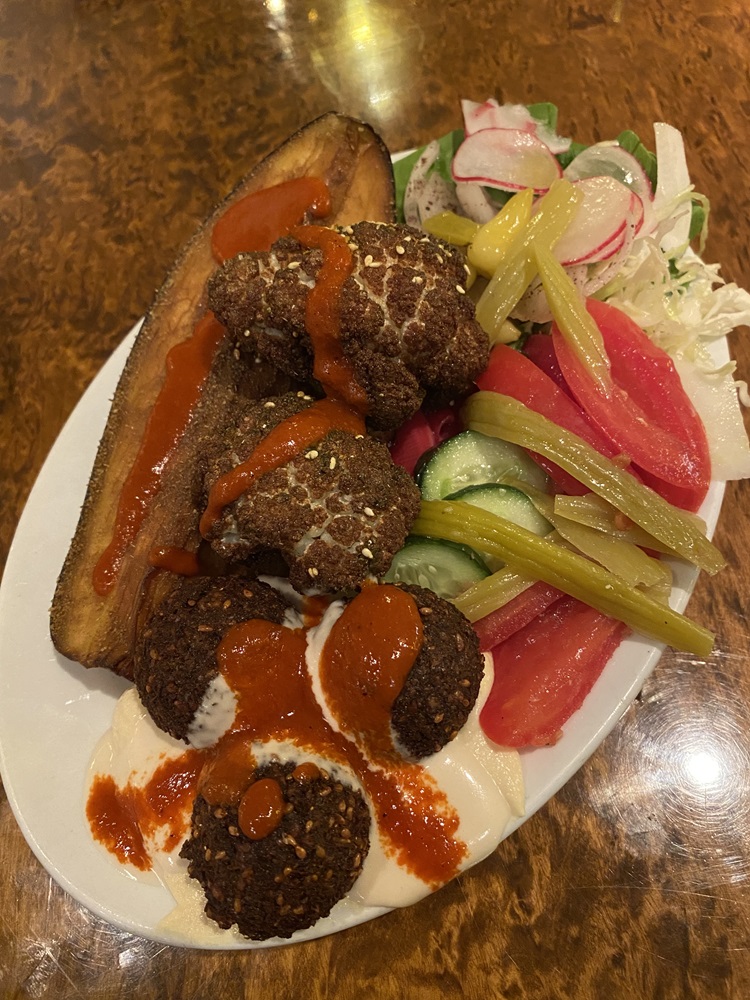 Jimmy’s Falafel sur George Street. Restaurant très fréquenté et probablement qu’il y a un peu de contamination croisée parce que tout le monde y mange des pitas. Mais leur assiette végétarienne de falafels est sans gluten et était absolument délicieuse!