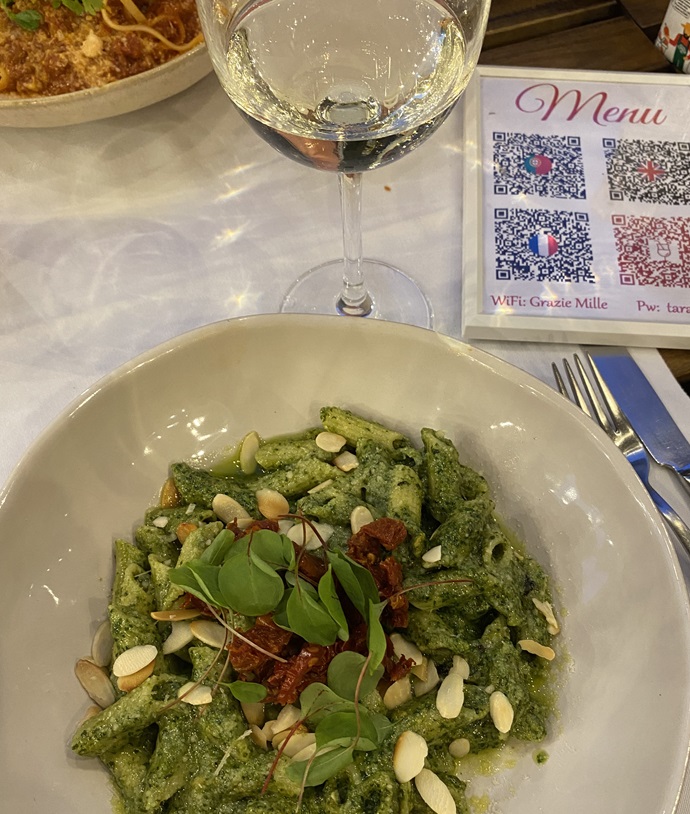 Grazie mille, rua de Cedofeita: Nous y sommes allés par hasard, cette rue touristique étant située tout près de l’endroit où on logeait. Mais je réalise maintenant que ce resto est coté 5 étoiles sur Tripadvisor. Notre instinct et le hasard étaient donc de notre côté ce soir-là! Jolie terrasse, pizza qui au-dire de fiston était fabuleuse, et pâtes offertes en version sans gluten pour moi! J’ai choisi les penne au pesto de basilic avec tomates séchées et amandes. C’était savoureux. Avec un petit verre de Vinho Verde bien entendu!