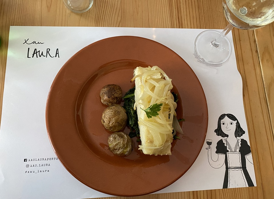 Xau à Laura, rue Miguel Bombarda: Petit resto absolument agréable tenu par deux frères jumeaux, qui avaient de toute évidence une sympathie pour une certaine Laura, personnage fictif qui tenait un petit restaurant dans un roman portugais. Xau à Laura signifie ‘Au revoir Laura’. Chaque item du menu nous a été expliqué en français, et l’un des proprios me disait en même temps si les items contenaient du gluten ou non.
