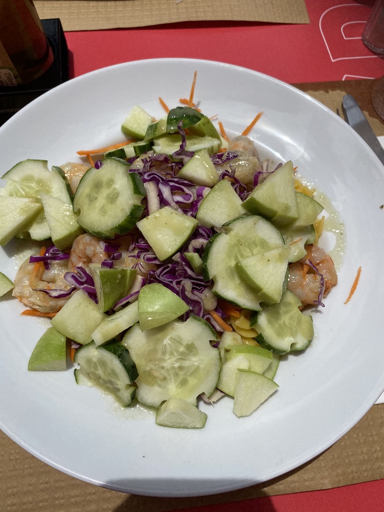 Nous sommes partis sur la route qui longe la côte Est de Sao Miguel, en partant de Nordeste, dans le but de nous rendre à Furnas en après-midi. Nous sommes arrivés à Provoaçao sur l’heure du diner, et la grande place était déserte, les locaux attendaient probablement le début du match du Portugal à l’Euro pour sortir dans les rues. Nous sommes tombés sur ce joli resto et sa terrasse, dont le menu avait une page complète invitant les clients à indiquer leurs allergies et intolérances, pour pouvoir en discuter. Le menu proposait aussi, entre autres, de faire sa propre salade avec une belle sélection de légumes, fruits, protéines végétales et animales, etc. La serveuse m’a donné des indications sur les ingérdients des différentes vinaigrettes et j’ai eu peine à finir mon énorme assiette remplie de crevettes, pommes et autres fraicheurs, pendant que mes compagnons se régalaient de calmars, brochettes de porc et croquettes de poulet. Un délice pour tout le monde!