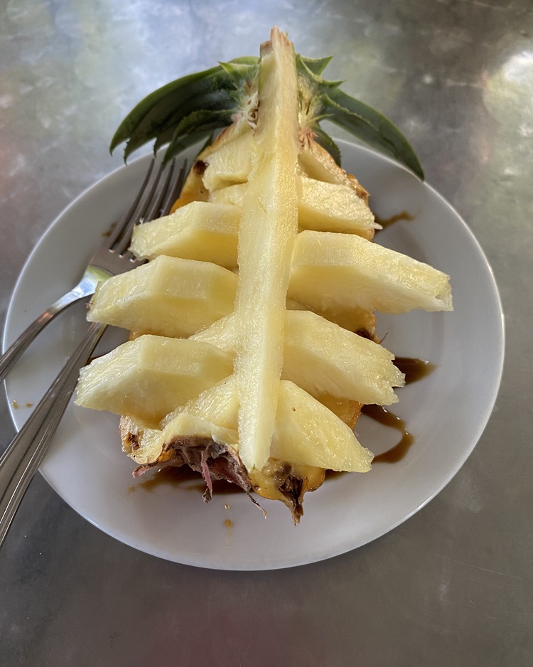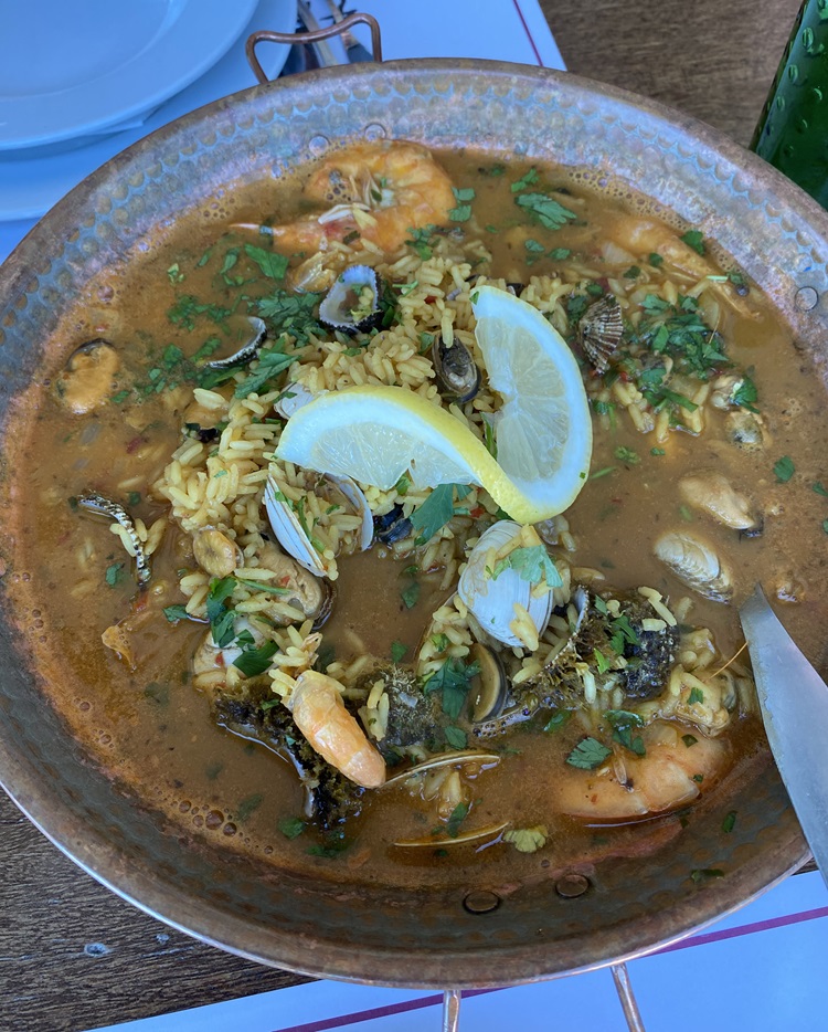 Ce restaurant revient souvent dans les listes de restos à essayer sur l’île. Ce fut donc une belle surprise pour nous de constater qu’il se trouvait à un kilomètre de notre lieu d’hébergement. Les plats principaux sans gluten sont identifiés sur le menu. Je n’ai pas pris d’entrée, et au dessert, on m’a proposé une assiette d’ananas; quand on sait que l’île est un producteur d’ananas, petits et sucrés, il est difficile de résister! En plat principaux, plusieurs choix s’offraient, et tandis que les enfants ont chacun commandé un des deux steaks au menu, chéri et moi avons décidé de partager l’assiette de riz portugais, qui s’apparente à une paella espagnole, mais qui est faite avec les épices particulières au Portugal. Crevettes, moules et huitres entremêlées dans du riz, et surtout dans une sauce relevée et tellement savoureuse! Un vrai délice. C’était une assiette pour deux, mais heureusement que fiston nous a aidés à terminer l’énorme portion! Ce resto offre une vue magnifique de sa salle à manger vitrée, mais aussi la possibilité de manger des en-cas sur sa terrasse avant, ou de commander des repas plus simples pour emporter. Nous avons eu le meilleur des deux mondes en mangeant dans la partie vitrée, et en prenant le dessert sur la terrasse avant en regardant un match de l’Euro, où malheureusement le Portugal n’a pas eu la soirée espérée contre la Géorgie.