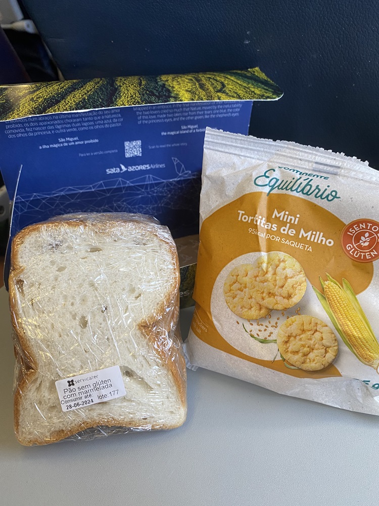J’étais tellement excitée d’enfin m’envoler pour les Açores que je n’ai aucun souvenir si un repas m’a été servi lors du vol entre Montréal et Ponta Delgada! Mais je me rappelle très bien avoir apprécié le en-cas qui m’a été offert sur le vol d’une durée de 2h20 entre Ponta Delgada et Porto. Une sandwich à la marmelade et un petit sac de craquelin au mais. Rien d’extraordinaire, mais tout à fait correct pour un vol de deux heures en plein après-midi.